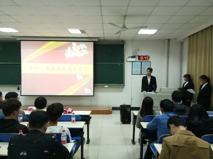 两任会长交接会旗后,第十七届会长宋晓爽发言,感悟过去一年作为会长的心路历程,同时寄语大一新生——确立目标,并朝着目标持之以恒地努力。接着,新任会长刘旭东发言,做新学年工作展望,并承诺将继承和发扬每周经济论坛的优良传统,反思和改进不足的地方。
