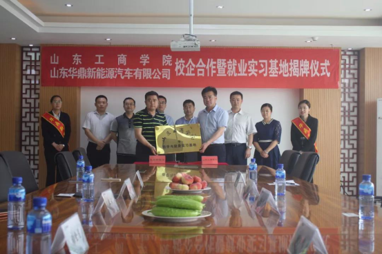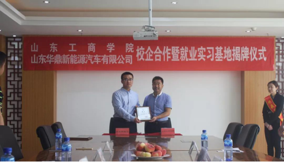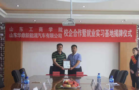 最后,山东工商学院与华鼎新能源校企合作暨就业实习基地揭牌仪式隆重举行,双方代表在校企合作协议书上签字,并为就业实习基地揭牌;之后,学院向企业高管刘尚伟董事长和王林总经理授予了校外教授、导师聘书。在友好热烈的气氛中,双方就合作的具体事项达成广泛共识。