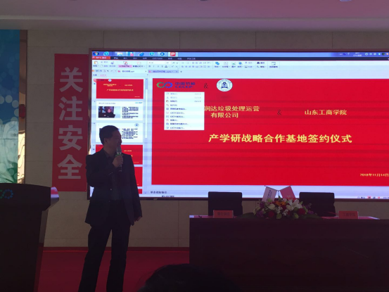 首先,中节能烟台润达公司王晓文总经理致欢迎辞,欢迎我院领导和代表的到来。王总表示,建立合作关系实现共赢是双方追求的目标,公司和我院建立合作关系,建立产学研战略合作基地,可以为大学生提供认识固废处理和学习实践的平台,为他们以后更好的发展和服务社会打下实践基础,是其身为国有企业应该义不容辞履行的一种社会责任。