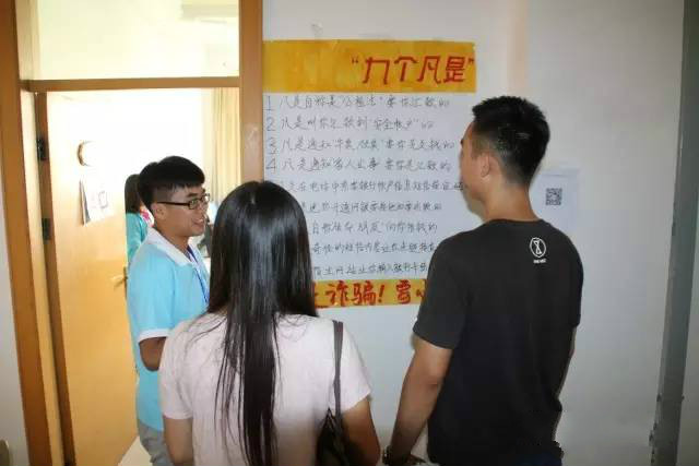 谭校长对我院张贴的“九个凡是”防骗宣传海报表示肯定,并指出一定要提高新生的安全意识,保证自身安全。刘新生书记来到迎新教室,与我院迎新工作人员交流,询问工作情况。