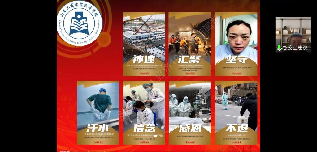 会议的第一项,主持人先是介绍了国家抗疫优秀事迹,火神山、雷神山医院的建设,疫苗的研发,“停课不停学”大型网络授课的进行……这些无疑都是日益强大的祖国为我们提供的重要保障。紧接着,主持人分别介绍了抗疫人物的杰出代表钟南山院士和李文亮医生。曾经非典的爆发,钟南山院士曾奔赴一线抗击非典,而当历史重演时仍义无反顾地做出同样的选择,钟院士的头脑、意志、勇气都是我们值得敬佩的。被誉为疫情“吹哨人”的李文亮医生即使因公殉职,但他英勇、朴实的形象永远刻在人们的心中。最后,主持人还强调了不仅仅是这些伟大的人物值得铭记,还有很多前线的志愿者建设者等等,他们也同样站在疫情的前线贡献着自己的一份力量。