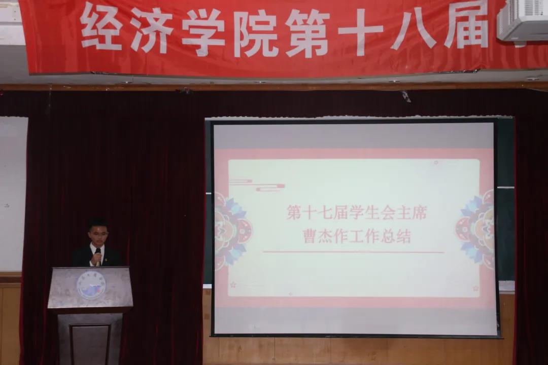 会议第二项:由第十七届学生会主席曹杰做工作总结。他从三个方面对BBV在线开户第十七届学生会工作进行总结汇报:首先,践行为学生服务的宗旨,开展注重打造家文化的一系列活动;其次,在加强学风建设、培养实践能力的基础上,开展各种竞赛活动,展现经济学子的风采,培养经济学子的实践能力;最后,提出应进行架构改革、完善考核机制、加强文化建设。